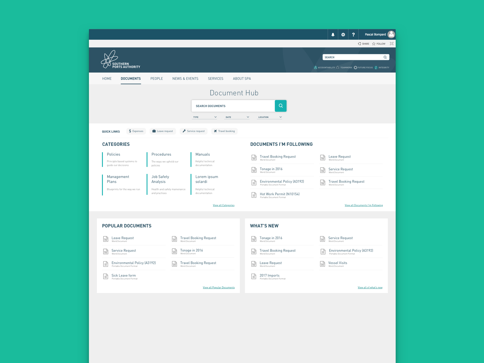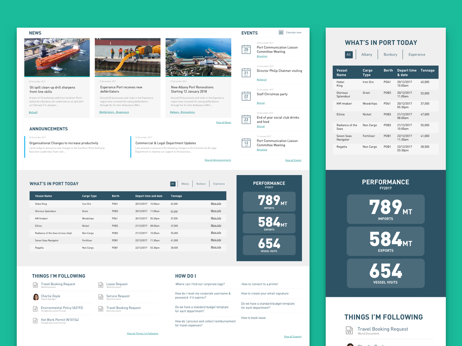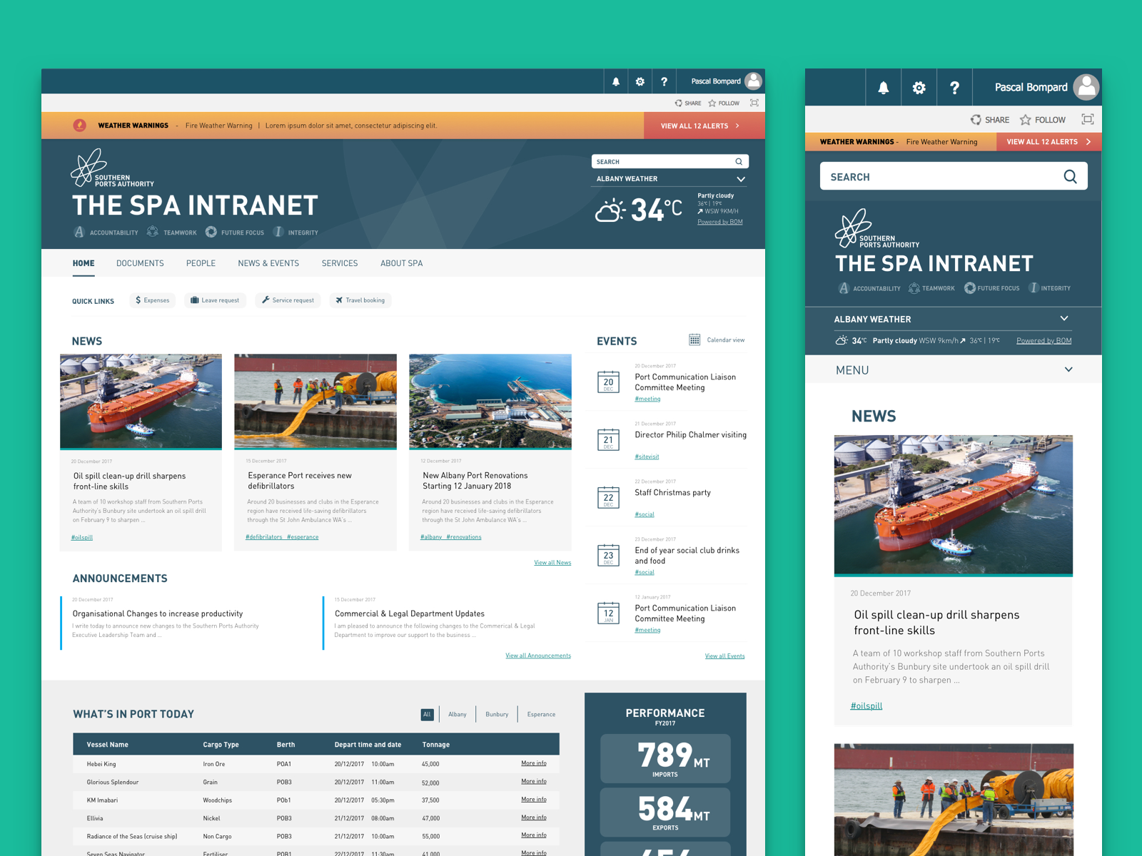 The Southern Ports Authority (SPA) functions as Western Australia’s gateway to the world market. It is comprised of three discrete ports: Albany, Bunbury, and Esperance that merged in late 2014 to meet the demands of a growing West Australian economy. With the consolidation, came the need to reaffirm their organisational identity and unify all the ports under a single, internal information and communication tool.